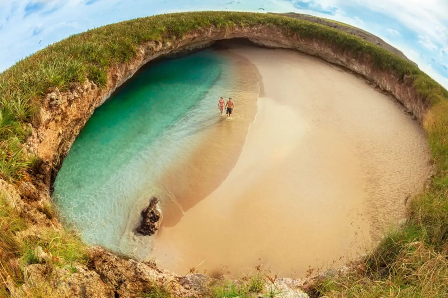 Playa Del Amor, commonly referred to as the Hidden Beach of Puerto Vallarta, is located in the Marietas Islands 22 miles west off the shore of Puerto Vallarta, Mexico. The beach features beautiful blue waters, all encased within an island cavern that only opens up to the sky above and the pacific ocean.